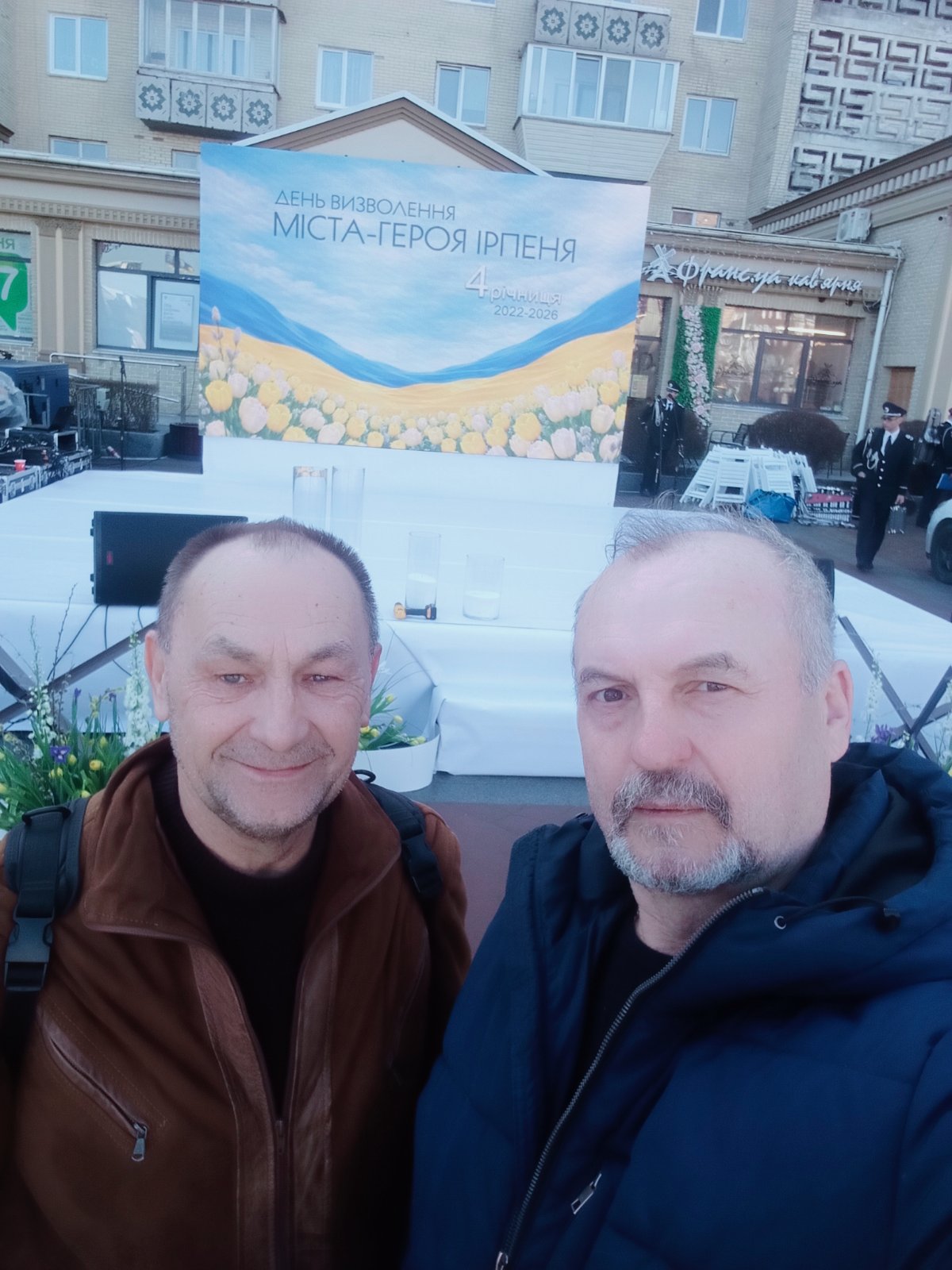 Валентин Собчук: Символічно, що доля звела в День звільнення Ірпеня в самому серці міста з одинм із бійців Іпінського ТрО, чий позивний був «Письменник». І це письменник Сергій Мартинюк (28.03.26)